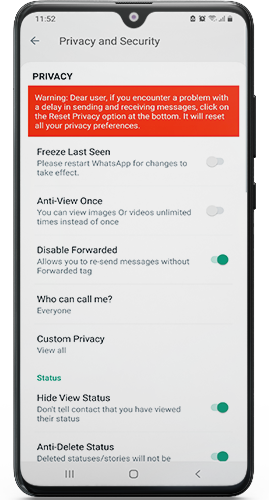 - Enhanced Privacy Settings: AGWhatsApp offers extensive privacy settings, giving users control over various aspects such as last seen status, read receipts, and who can call or see their profile. Users can configure customized privacy settings for individual chats, ensuring a personalized and secure messaging experience.