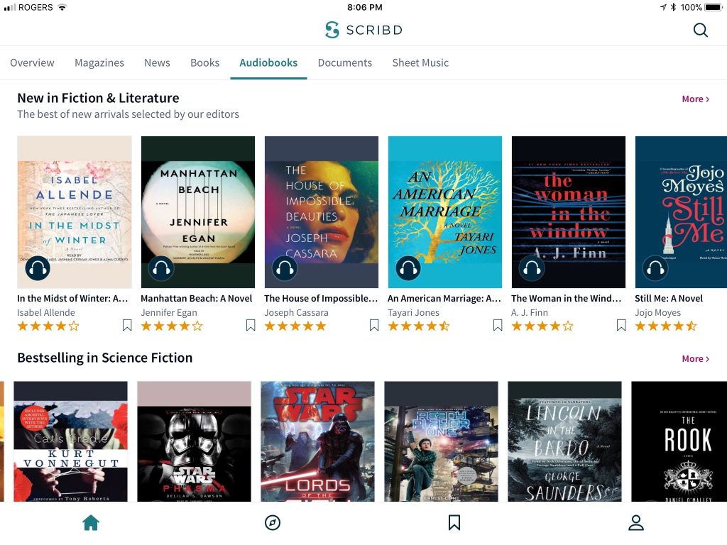The membership to Scribd, which is very similar to Audible and provides a one-month free trial, costs $9.99 a month.