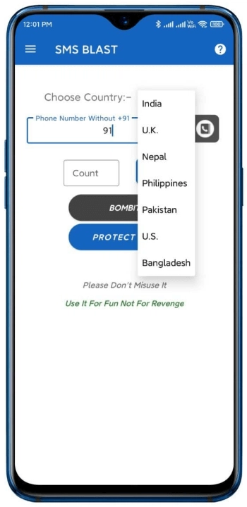 - Support for Multiple Countries: The majority of SMS bombers are accessible, however they only allow you to text bomb certain countries’ phone numbers. For BombitUP, we hope that’s not the case. SMS bomber, BombitUP. Users of the app get access to all of the major nations’ phone numbers. This function will be adored by many users. India, the UK, Nepal, the Philippines, Pakistan, the United States, and Bangladesh are among the nations mentioned.