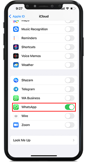 - After you activate that from the same place scroll down a bit and activate WhatsApp, to back up your chats.