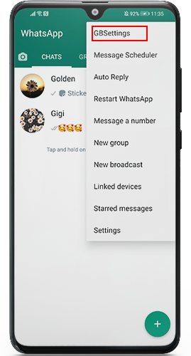 - Within WhatsApp Plus, access the GBsettings menu by clicking on the corresponding icon.
