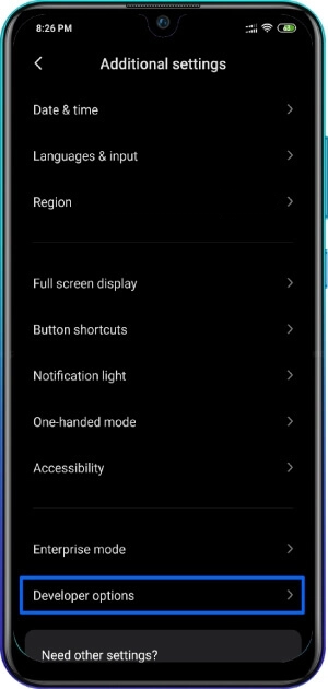 - Navigate to Settings > Additional Settings > Developer Options on your mobile device.