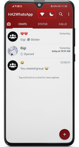 Enable the Dark Mode: Hawa WhatsApp introduces a dark mode feature, represented by a crescent icon. By activating the dark mode, you can enjoy a visually appealing interface with reduced strain on your eyes. Additionally, you have the option to turn off the internet exclusively within the app.