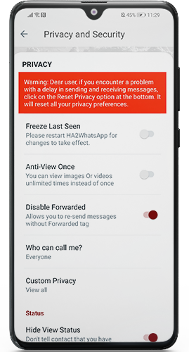 - Privacy Control: With Hawa WhatsApp, you can hide your viewing of WhatsApp statuses, online status, and last seen timestamp, providing greater privacy and control over your online presence.