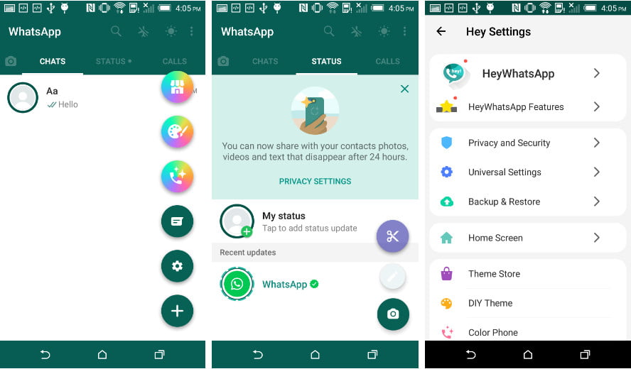 HeyWhatsApp is an updated and modified mod of the original WhatsApp. The WhatsApp MOD that has been developed from one of the most popular: YOWhatsApp . In this Mod, we will find similar functions of this one, but also other own characteristics that have to do with the aesthetic customization of the user interface. HeyWhatsApp has a modified user interface to make it stand out more and uses a similar license and protocol as WhatsApp.