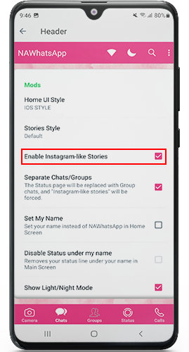 Instagram Stories: Transform your NA4WhatsApp Pink status into Instagram-like stories, making your updates more engaging. Enable this feature in NA Settings < Home Settings > Header > Enable Instagram-Like Stories.