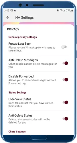 - Privacy Features: NAWhatsApp provides options to hide double ticks, blue tick seen messages, and call log notifications, ensuring user privacy and discretion.
