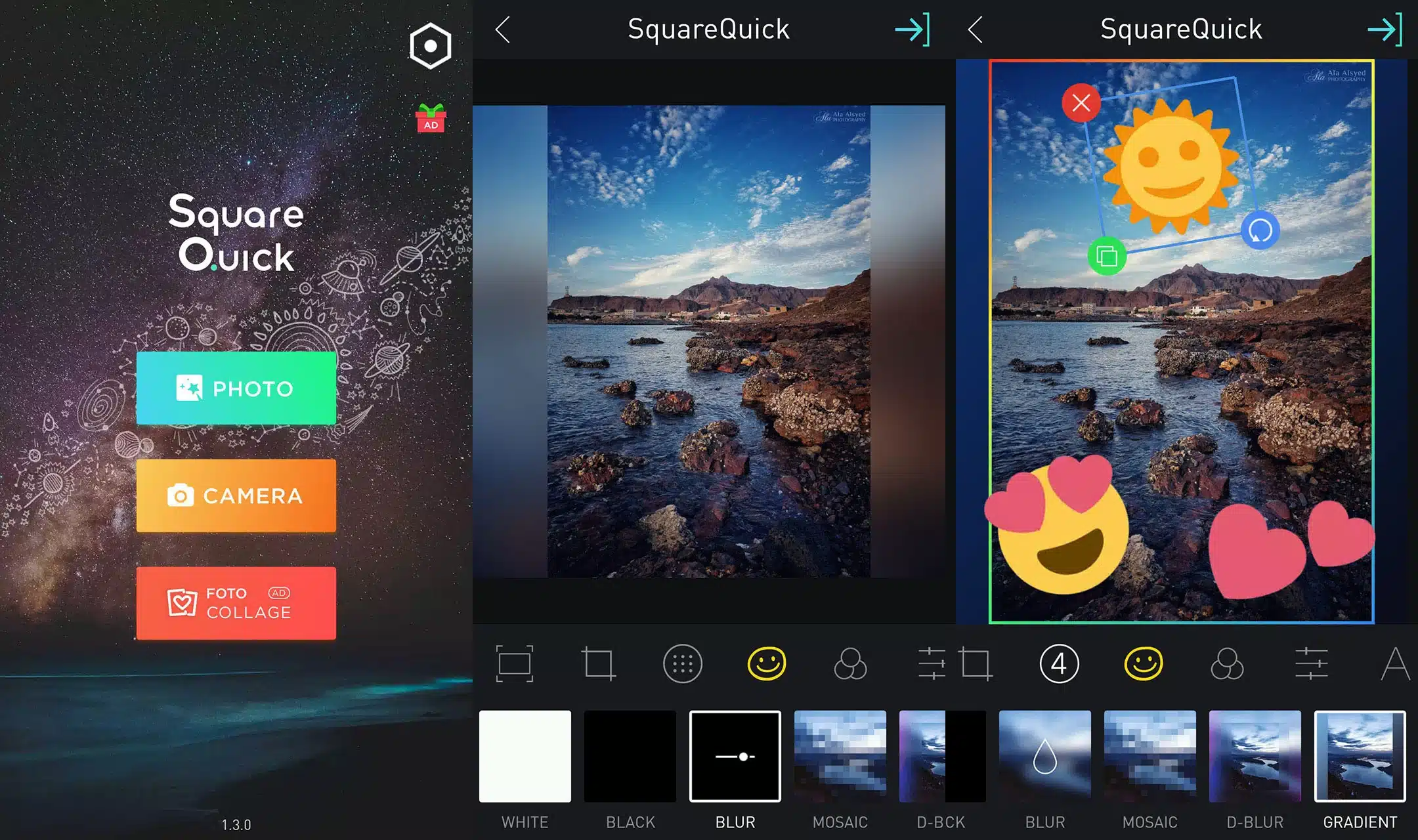 - Overlays: Add depth and dimension to your photos with overlays. Whether you want to add textures, gradients, or light effects, Square Quick provides a variety of overlay options to suit your creative vision.