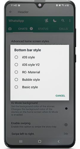 Control Main Interface: Users have control over the main interface of WhatsApp Aero, allowing them to hide the floating button, customize the shape of the upper menu bar, and change the style of WhatsApp status to resemble Instagram.
